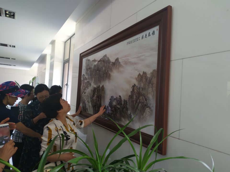 步入一楼宽阔的大厅,正对门口的墙面上挂着一幅题为“惟真是求”的山水风格画作,这是85级系友此次毕业三十周年返校共同送给母系的礼物。母系把它挂在了系楼一楼大厅。系友们纷纷在画前留影。