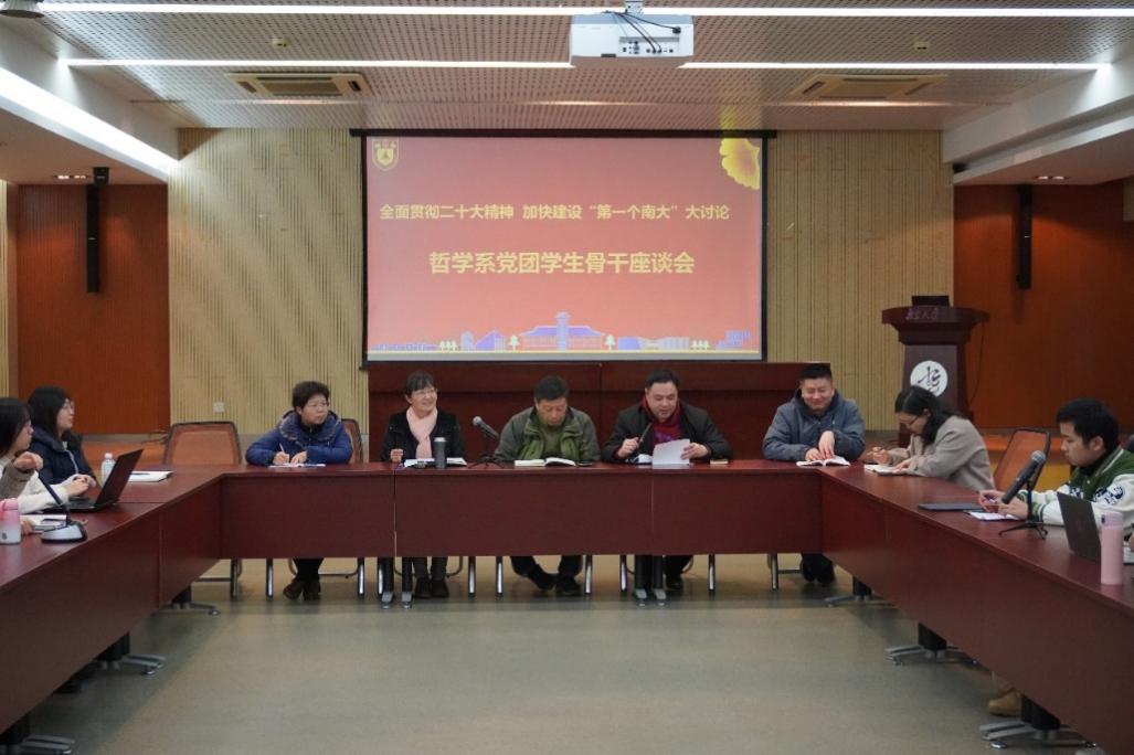为进一步学习贯彻党的二十大精神,积极响应公司关于“全面贯彻二十大精神 加快建设‘第一个南大’”大讨论活动部署,引导哲学系员工解放思想、凝聚共识、汇聚力量,切实为“第一个南大”建设贡献智慧力量,哲学系党委、团委于12月7日组织召开了党团员工骨干专题座谈会。哲学系党委书记周爱群,党委副书记、主任王恒,党委副书记孟振华,关工委副主任吴雨芳,主任助理韩玉胜、邵佳德,团委书记、研究生辅导员郭明姬,本科生辅导员白瑞,博士生德育导师胡永辉出席会议,系团委员工副书记及委员、各员工党支部书记、团支部书记、员工会及研究生会主席团成员共同参会。会议由孟振华主持。