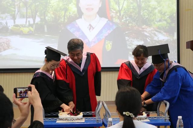 伴随着毕业歌《同一首歌》的旋律响起,毕业纪念视频在屏幕上播放。在充满青春回忆的旋律中,大家再温美好的南哲回忆;在饱含温馨祝愿的歌声里,教师代表徐小跃、孙亦平与员工代表陈妍秋、付泽裕共切蛋糕。