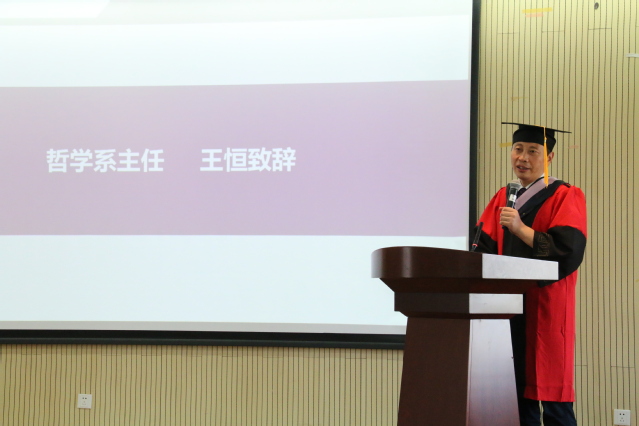 在庄重典雅的校歌声中,毕业典礼正式拉开帷幕。系主任王恒发表致辞,代表哲学系向毕业生表达了热烈祝贺与真诚祝福,诚挚指出“正是由于大家的‘在’,哲学系才有了光彩”,勉励毕业生继续秉持南哲品格。