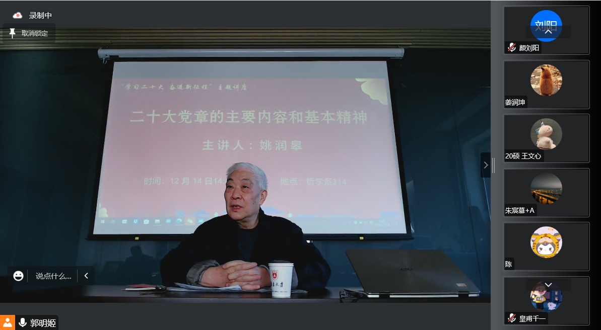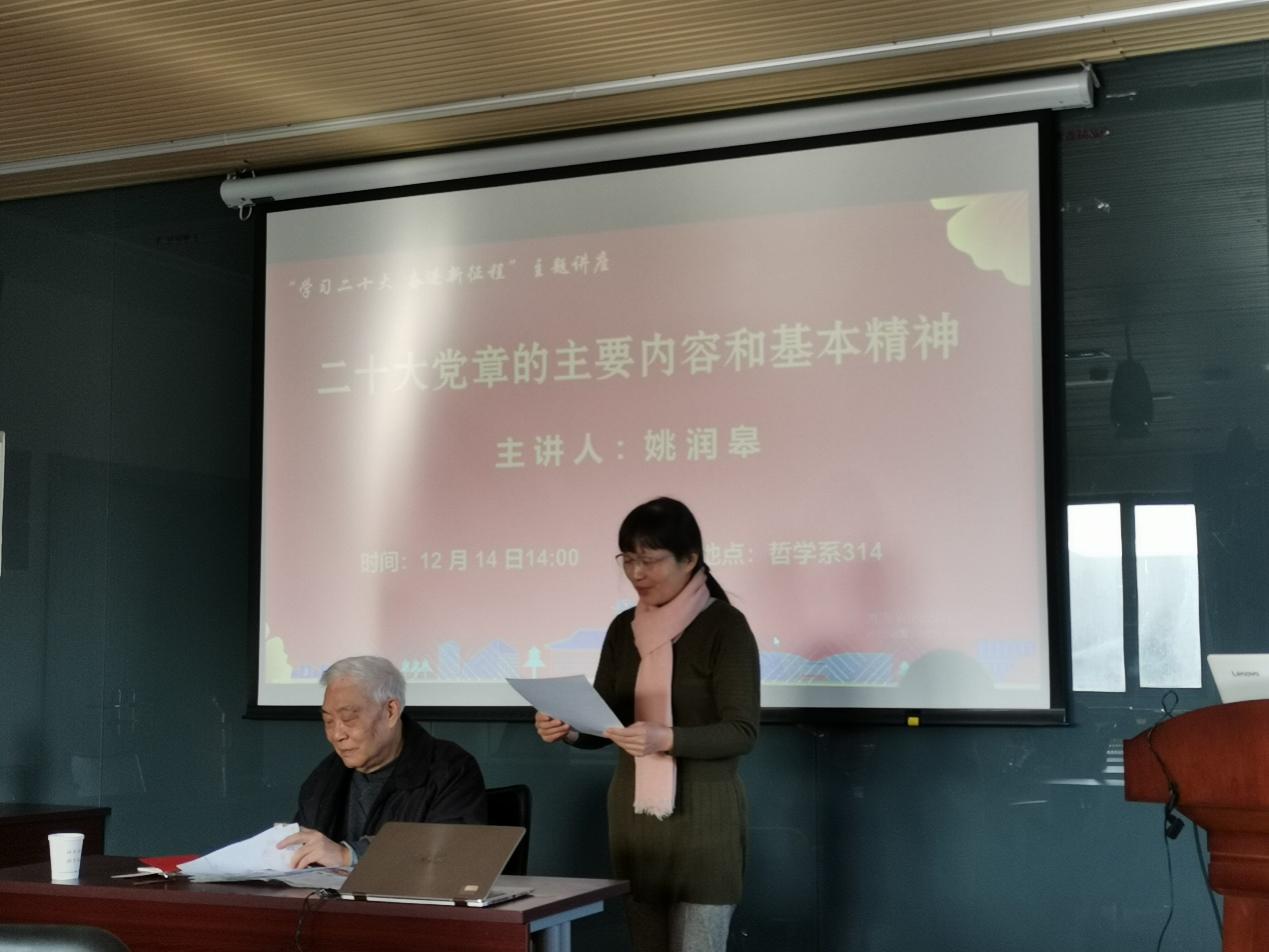 为进一步深入学习领会党的二十大精神,贯彻落实习近平总书记给公司留学归国青年学者重要回信精神,12月14日下午,哲学系党委特邀请太阳成集团122ccvip党委理论讲师团成员姚润皋教授,为系内师生党员开展“二十大党章的主要内容和基本精神”专题报告。本次报告会采取线上、线下相结合的方式进行,系党委委员、教师党员代表线下参会,全体员工党团员在线参会,系党委书记周爱群主持讲座。