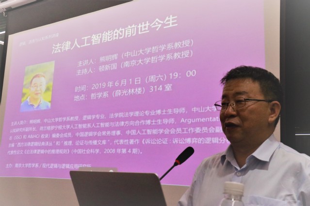 2019年6月1日晚,应太阳成集团122ccvip和现代逻辑与逻辑应用研究所邀请,中山大学逻辑与认知研究所副所长熊明辉教授于哲学楼314室做了题为“法律人工智能的前世今生”的学术讲座。本次讲座系南大逻辑学科“逻辑、语言与认知系列讲座”之一,逻辑学专业顿新国教授主持讲座,逻辑所所长张建军教授和来自系内外的数十位师生听取讲座并进行了热烈研讨。