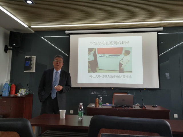 哲学咨商,即哲学咨询(philosophical counselling ),在台湾发展迅速。黎建球教授首先向大家介绍了哲学咨商的引进背景。黎教授介绍说,受马里诺夫(Lou Marinoff )、拉伯(Peter Raabe )的著作的影响,21 世纪初他在辅仁大学逐步发展起哲学咨商的研究与实务。接着,黎教授介绍了台湾辅仁大学的哲学咨商的建设情况。在辅仁大学,哲学咨商的课程包括辅导咨商、西方哲学家咨商方法论、中国哲学家咨商方法论、现象学、诠释学、生命哲学、价值哲学以及团体辅导学。他说,哲学咨商的开设引起很多人的兴趣,辅仁大学和很多社会机构展开了合作。 随后黎建球教授谈到了哲学咨商的理论建构和发展。他说,随着哲学咨商的发展,台湾的哲学咨商界同仁开始思考如何建立一个适合台湾、甚至华人地区的哲学咨商体系。他认为,在理论建构的内容上除了辅仁大学的身份(天主教哲学)及在西方世界中所流行的哲学咨商方法及理论外,也应加入华人地区的主流思想;为此,在辅仁大学哲学咨商的理论建构的目标被确定为士林哲学的精进(士林哲学即天主教哲学)、中华文化的融合和辅仁学派的建构。黎建球教授认为华人地区的哲学咨商的基础理论应该是整全的、普遍的和人文主义的。 接着,黎建球教授分析了心理咨商的关系以及哲学咨商的基本原则。他说,哲学咨商和心理咨商的不同就是价值观的不同处理上。他认为,情绪在价值观之后,哲学咨商并非如同心理咨商一样保持价值中立,而是有一套价值系统,这一套价值系统和它的哲学系统是一致的,是由形上学到知识论到伦理学的一套从外在到内在再回到外在的完整价值观。黎教授提出了先要时空定位再到人性价值,走向生命尊严,从而得出伦理行为论。为此,他分析了哲学咨商的基本原则:第一是医病关系,哲学咨商在理清观念时可以帮助当事人减除困惑以面对问题。第二个是价值引领,黎教授认为价值哲学中的假设是以希腊哲学家亚里士多德和中国儒家孔子的理论为其根据而建构的价值哲学的内容。亚里士多德和孔子都是目的论,幸福论。第三个原则是互为主体,而互为主体必须以主体与主体之间的日常生活的讨论为其内容并以检核这些日常生活的意义和价值为目标,旨在说明哲学咨商师与当事人都是单独的主题。 最后,黎建球教授从人才培育、组织发展、积极参与、成立学会和永续经营五个方面展望了哲学咨商的未来发展。他说,在台湾目前已有七个大学开设有关哲学咨商的课程,哲学咨商学会自成立后每个月都有各个有关领域的人士加入。各式的工作坊、读书会超过40 个,2011 年成立了台湾哲学咨商学会(TPCA) ,创始哲学咨商师督导及高级讲师都是要经过严格训练后得到认证。黎教授认为哲学咨商在台湾已逐渐发展为一种运动,其未来仍需须在理论发展以及与其他学科的结合方面努力。 黎教授的讲座幽默诙谐,时不时以具体案例加深同学们的印象。在交流环节,黎教授就“哲学咨商中所面临的主要问题”、“哲学咨商与心理咨商的区别以及流派观点”等听众提出的问题给与了精彩的回答。