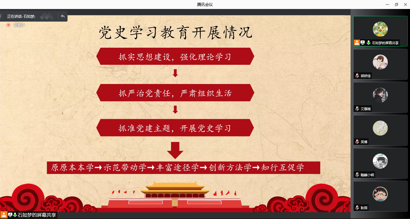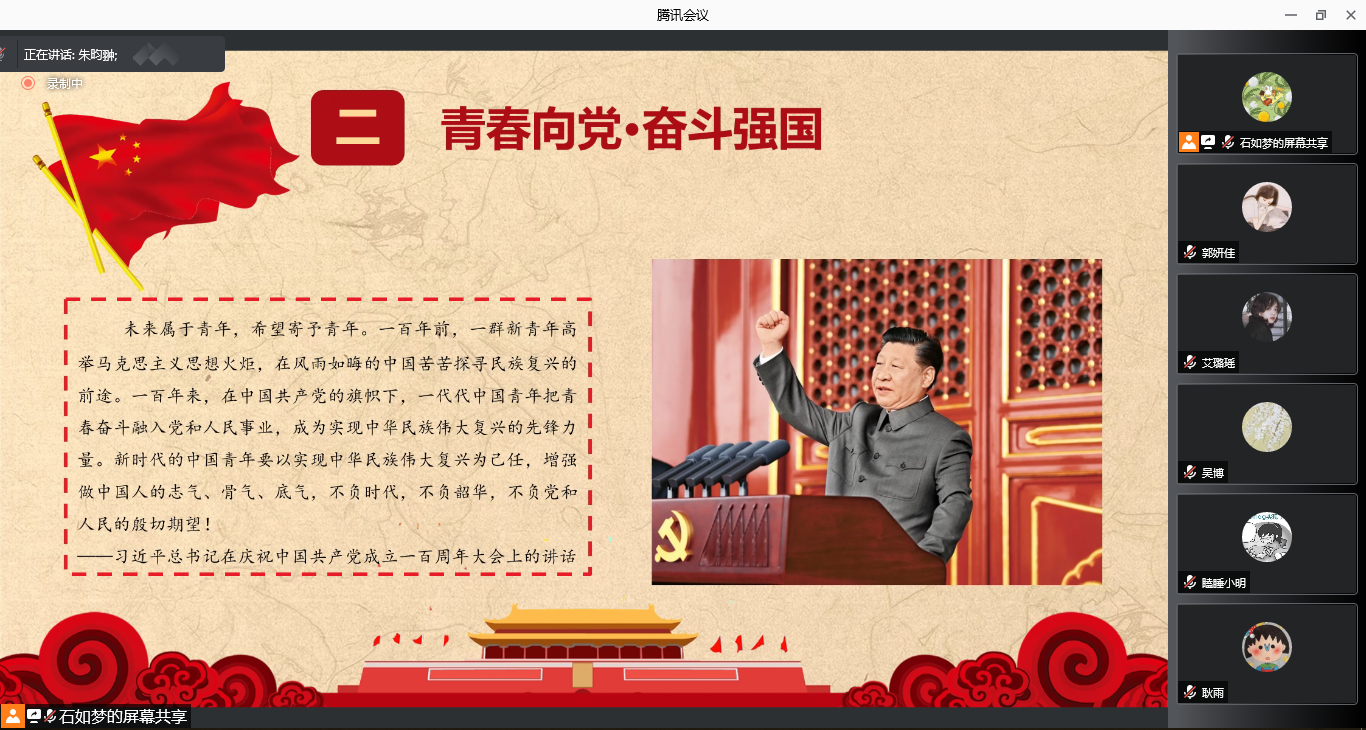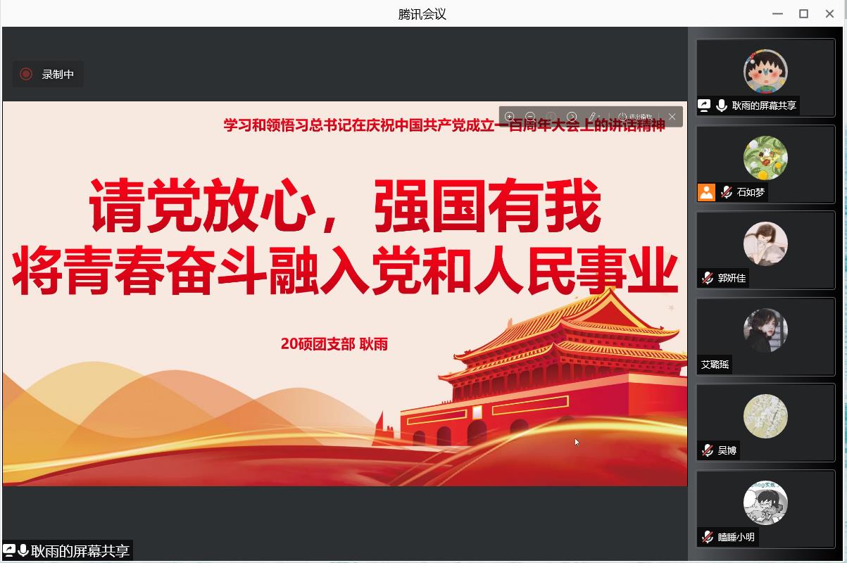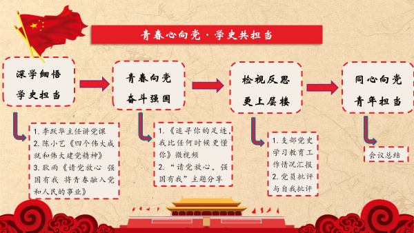 会议分为“深学细悟,学史担当”“七一”重要讲话精神学习、“青春向党,奋斗强国”主题团日和“检视反思,更上层楼”党史学习教育落实情况检视三个环节。