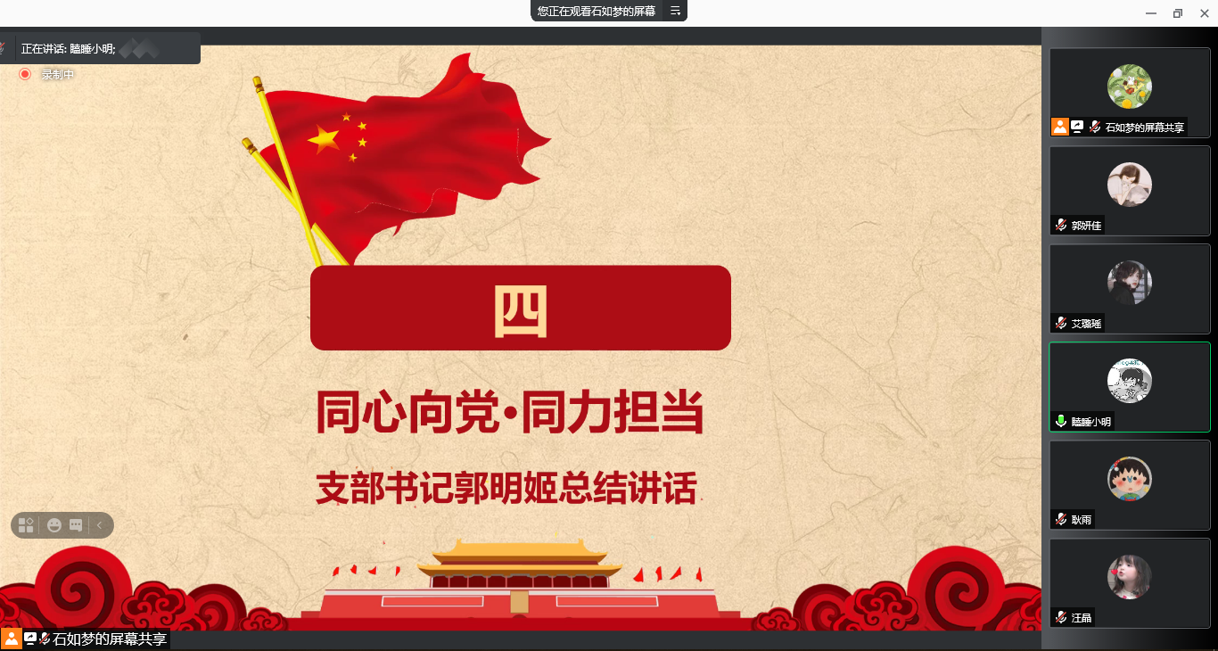 随后,团支部委员陈小艺、耿雨分别围绕“四个伟大成就和伟大建党精神”、“将青春融入党和人民的事业”进行了“七一”讲话学习心得分享。陈小艺指出,共产党成立以来,中国社会迎来新民主主义革命的伟大成就、社会主义革命和建设的伟大成就、新时代中国特色社会主义的伟大成就、改革开放和社会主义现代化建设的伟大成就。党的领导是创造“四个伟大成就”的根本前提,马克思主义及其中国化成果是创造“四个伟大成就”的科学指引,伟大建党精神是创造“四个伟大成就”的力量源泉,勇于自我革命是创造“四个伟大成就”的重要保障。耿雨从“树立远大理想,增强做中国人的志气”、“厚植爱国情怀,增强做中国人的骨气”、“练就过硬本领,增强做中国人的底气”三个方面分享学习心得,引导青年团员共同思考新时代中国青年如何担当民族复兴大任。
