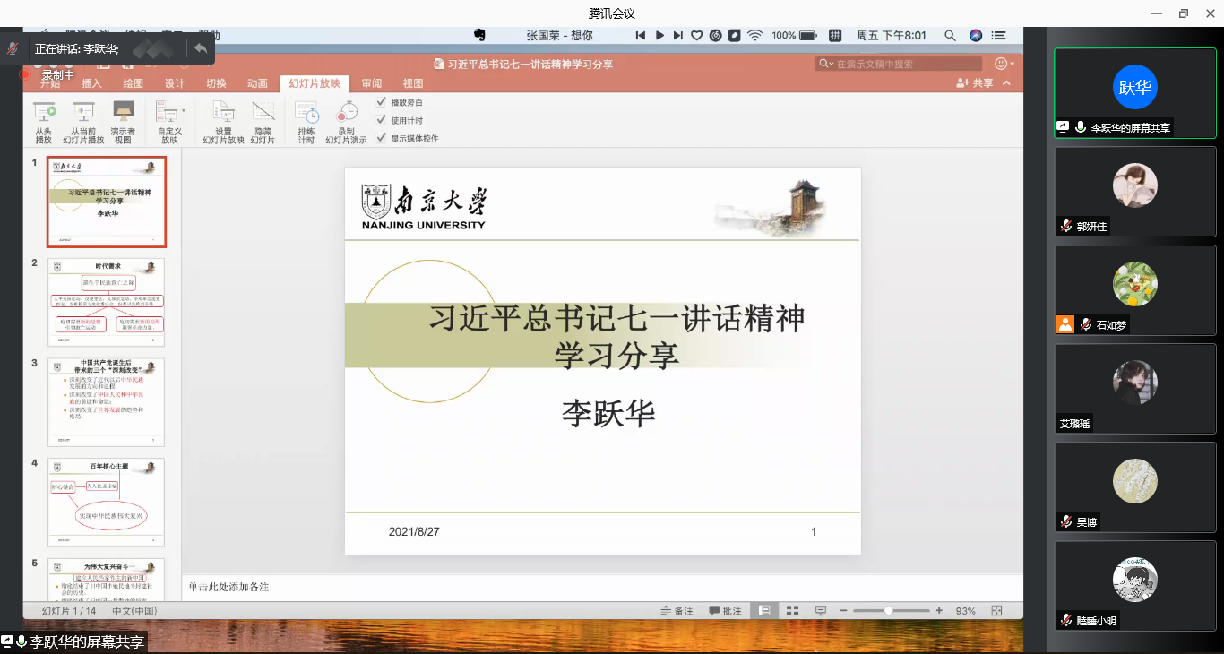 会议第三环节,由党支部副书记石如梦代表支部委员会报告半年来支部工作情况特别是开展党史学习教育情况,通报支部委员会检视问题情况,制定整改措施。石如梦指出,上半年支部党史学习教育工作在以下五个方面取得良好成效:一、原原本本学,以习总书记“七一”重要讲话和党中央指定学习材料为蓝本,要求党员坚持不懈、原原本本通读。二、示范带动学,充分发挥党史学习小组作用,由党员带动积极分子、团员共同学,保证了每名党员、积极分子都能严格落实规定、全面掌握内容,学习领悟精神。三、丰富途径学,结合主题党日、志愿服务、专题党课等活动推动学史力行走深走实。四、创新方法学,发挥南京红色资源优势,组织参观红色遗迹,以沉浸、生动的形式提升党史学习的体验感。五、知行互促学,对照“学党史、办实事”要求,带领党员在员工工作、学术创新、志愿服务、疫情防控中发挥先锋模范作用。