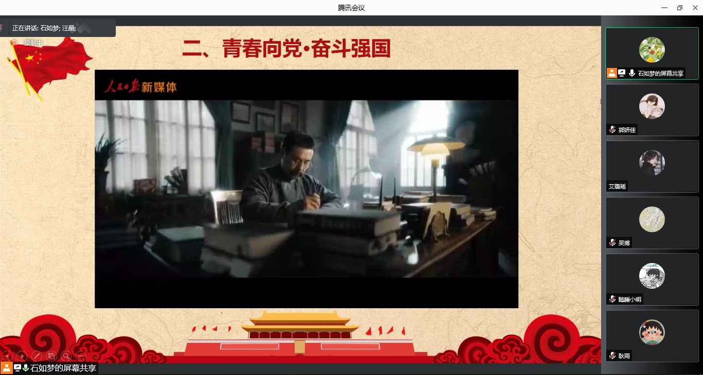 会议第二环节,团支部书记汪晶带领与会成员共同观看微视频《追寻你的足迹,我比任何时候更懂你》,直观感受到了中国共产党奋斗的百年历程。观看结束后,党员、团员围绕“青春向党,奋斗强国”畅谈个人学习体会。