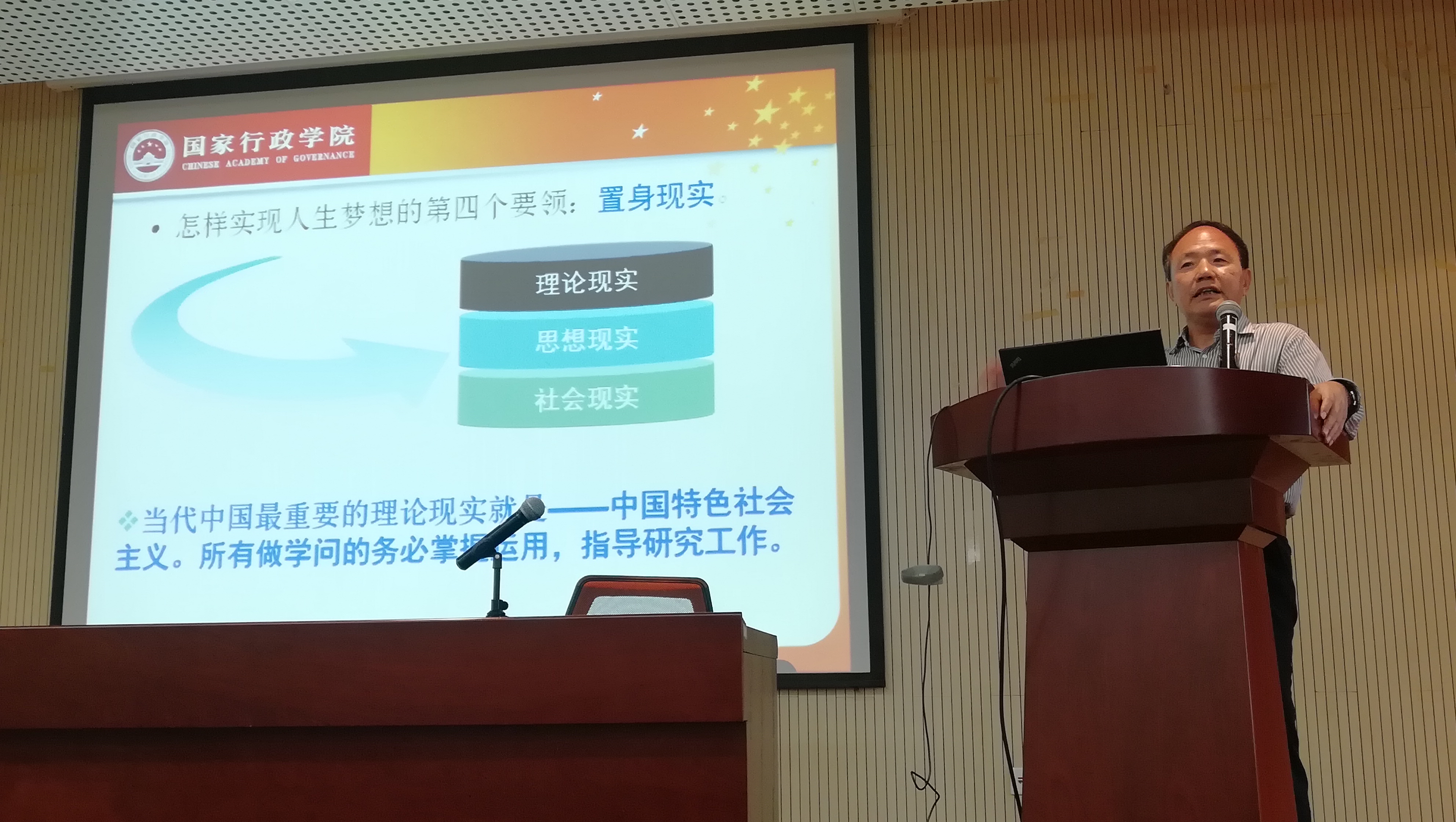 (4)置身现实。周老师鼓励同学们不要埋头读书,而要置身现实地学习思考,拥抱现实,现实才会拥抱你,这是“成材”最终的诉求。周老师把现实分成三个层次:理论现实、思想现实与社会现实,这三方面同学们都应该了解与关注,其中中国特色社会主义理论是当今社会发展中尤其应当关注的。在做论文的具体问题上,周老师指出论文的题目应从现实中寻找,而不要从书本中找。