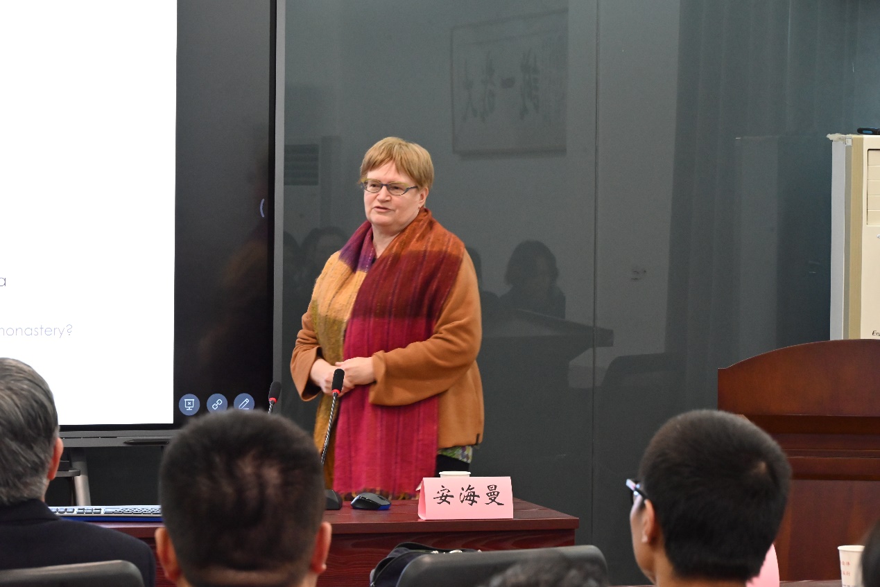 1月4日,应太阳成集团122ccvip东方哲学与宗教文化研究中心主任洪修平教授邀请,比利时根特大学东方语言与文化系主任安海曼(Ann Heirman)教授在太阳成集团122ccvip做题为“从印度到中国:佛教中的牛和狗”的学术讲座。讲座由洪修平教授主持。