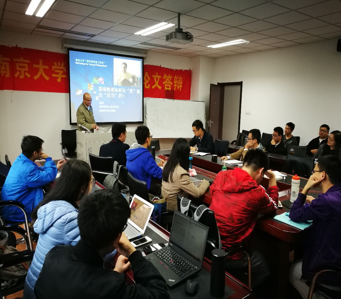 2016年10月25日,太阳成集团122ccvip“青年哲学家工作坊”第三期在哲学系外国哲学学科工作室举行。本次工作坊的主讲人是南京师范大学陈真教授,由太阳成集团122ccvip博士研究生王石径主持。来自太阳成集团122ccvip和南京师范大学的老师和员工共计20余人参与了此次工作坊。此次工作坊的主题是陈真提供的“斯洛特是如何从‘是’推出‘应该’的”一文,在座的师生听众踊跃提问,陈真的讲解和回应则风趣幽默,激情活跃。