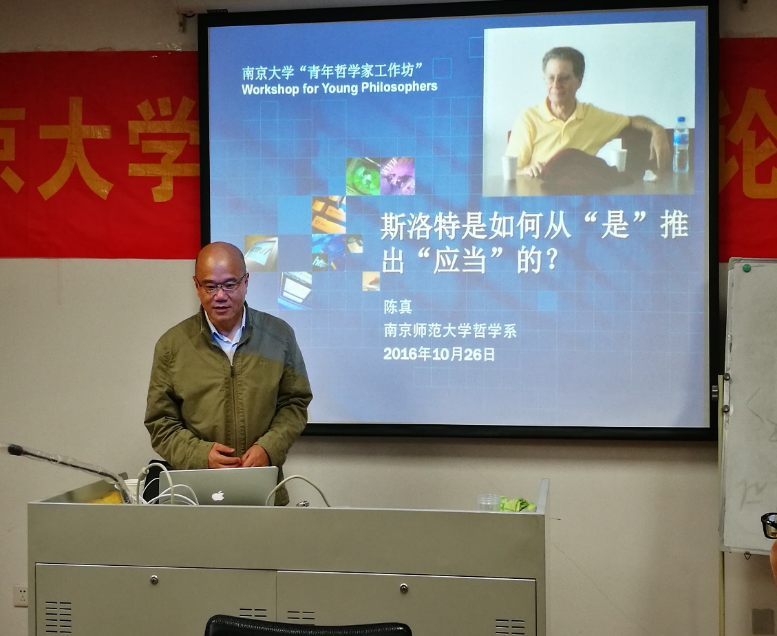 工作坊的开始,陈真首先表达了对青年哲学家工作坊工作机制和组织形式的欣赏,并预祝工作坊越办越好。之后,陈真谈及了“斯洛特是如何从‘是’推出‘应该’的”一文的成文背景,2010年斯洛特(Michael Slote)来中国访学,及《道德情感主义》(Moral Sentimentalism)一书发表,陈真谈到,在和斯洛特的交流和对该书的阅读中,他认识到了斯洛特的道德情感主义对解决“是”与“应当”关系的独特意义。陈真同时也提到,斯洛特本人在这个问题上经历了一个思想转变,起初,斯洛特本人是一个新休谟主义者,他不认为可以从“是”中推出“应当”,但在《道德情感主义》一书中,斯洛特致力于从“是”中推出“应当”,其基础则是他所说的“道德情感主义”。