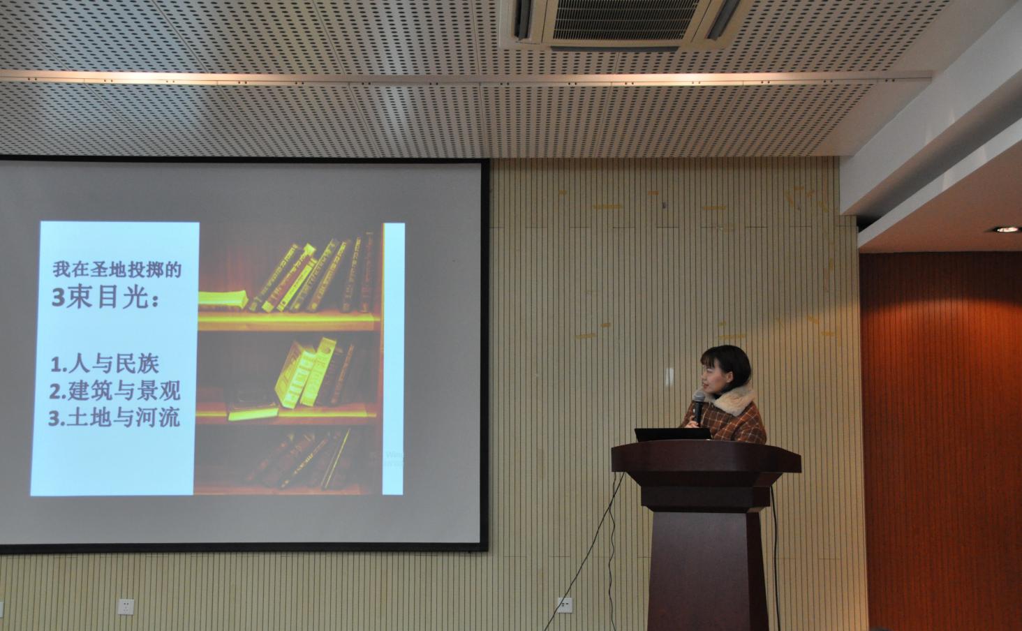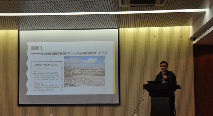 活动第二个环节,在孔伟宇同学主持下,曹永泰、彭羽菡、施思、王欢四位同学分享了他们在以色列的游学之旅。曹永泰同学带着“什么是宗教?什么是信仰?”这两个问题踏上了以色列的土地,他以死海、约旦河与加利利湖之“水”为线索,谈及了“水”这一意象在不同文化中对宗教、道德、审美方面的影响。彭羽菡同学讲述了自己看以色列的三束目光:“人与民族”“建筑与景观”“土地与河流”,通过分享沿途的照片,分享了她的感悟。施思同学感慨道,以色列之旅使她在书本上学到的东西活了过来,在这个矛盾的国度里体验着完全不同的生活。王欢同学通过展现行程中的所见所闻,如哭墙下的成年礼、墙缝中的纸条、马萨达遗址等等等,带领在场同学共同体验了那一段美好的时光。