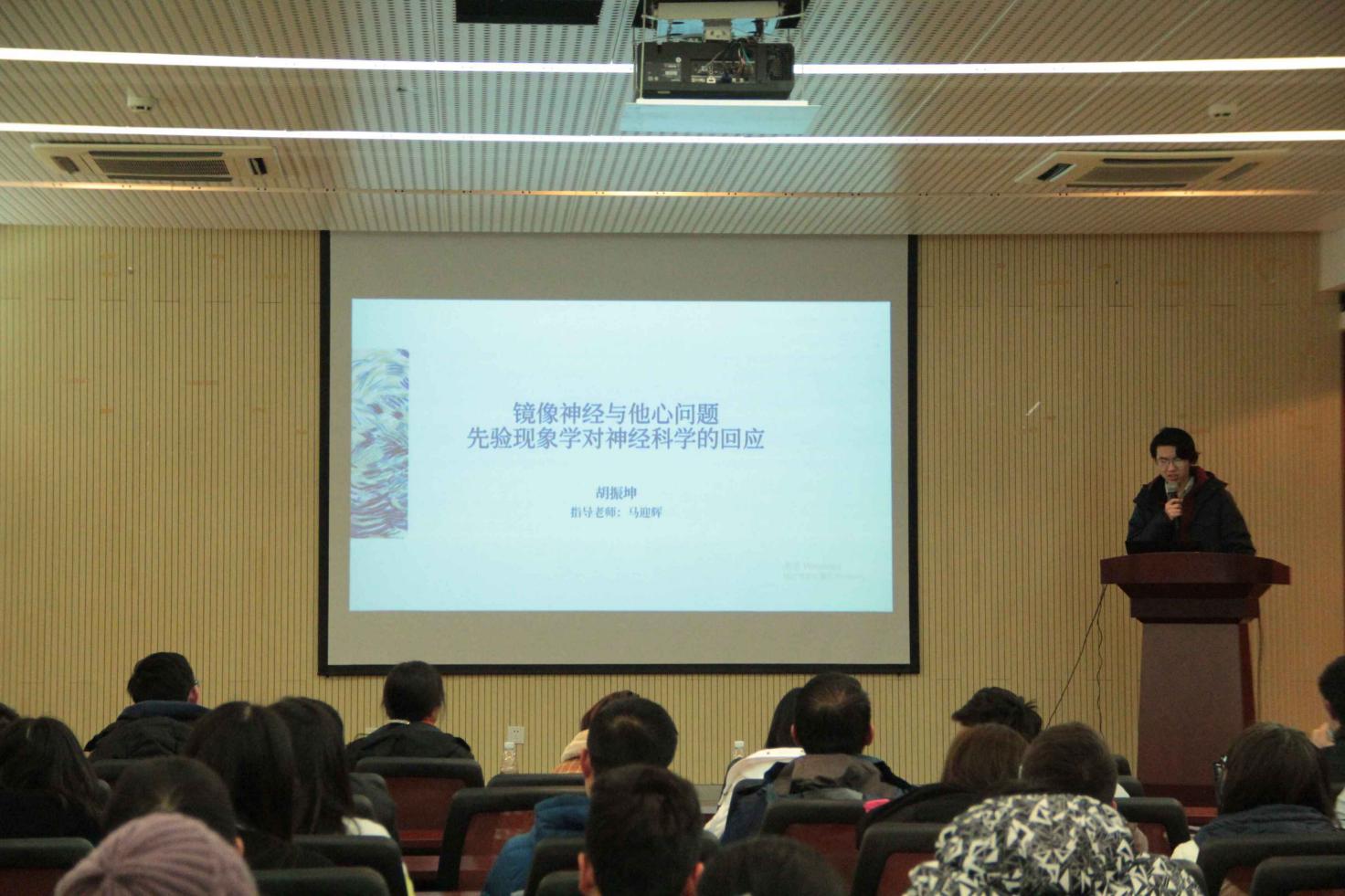 随后,八位本科生学术基金项目的参与同学做了项目的报告。陈薪水同学从选题意义、思路、等方面阐述了“劳动的异化”的课题;来自历史公司的高旭东同学结合《申报》对爱因斯坦的报道介绍了他的课题“近代科学技术在中国的早期大众传播史”;原计算机公司现转入哲学系的胡振坤同学结合现代神经科学,介绍了自己的研究“镜像神经与他心问题——先验现象学对神经科学的回应”;刘明疑同学介绍了他的课题“德性伦理学的复兴及其当代意义”;徐心童同学从CSSCI的实证研究出发,探索了国内高校哲学社会科学领域研究生科研贡献率;张怀远同学以十分专业的术语介绍了自己的课题“你不能从你看见我的地方凝视我”,从现象学观点出发对拉康对梅洛·庞蒂对批评做出反思;张天舒同学则探索了“宏大叙事与艺术的终结——丹托的艺术史哲学”;张兴鑫同学主攻科学哲学,详细介绍了“实验室壁垒的破与立”。同学们精彩的报告展现了哲学专业不同研究方向、领域的特色,他们的演讲令在场同学们受益良多。