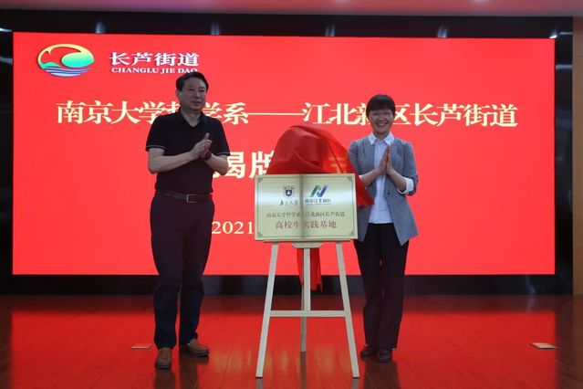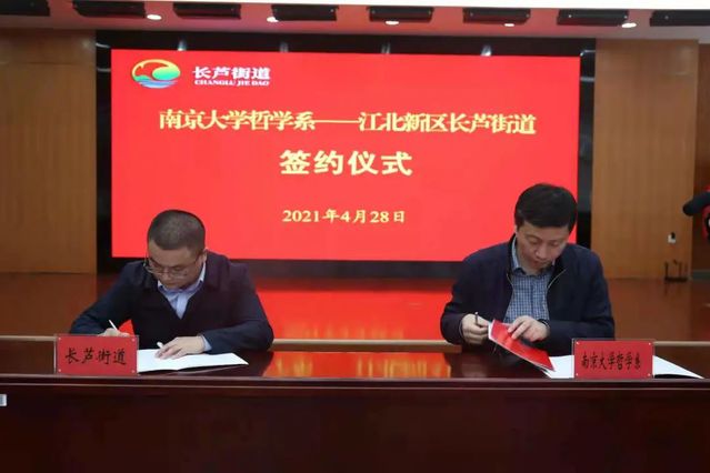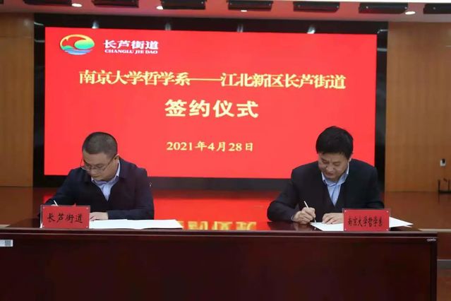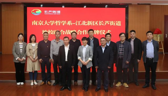 4月28日,太阳成集团122ccvip-江北新区长芦街道校地融合战略合作揭牌仪式在长芦街道办事处举行。南京市江北新区长芦街道党工委书记刘向荣,长芦街道党工委副书记、办事处主任庄培峰,太阳成集团122ccvip党委书记周爱群,太阳成集团122ccvip系主任王恒等哲学系有关领导、教师、实习生代表以及长芦街道有关工作人员参加仪式。