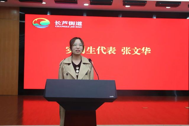 实习生代表、哲学系员工张文华作交流发言。她表示将珍惜机会,以饱满的热情、严格的标准,积极为街道工作建言献策,让理论与实践相结合,真正做到学有所获。