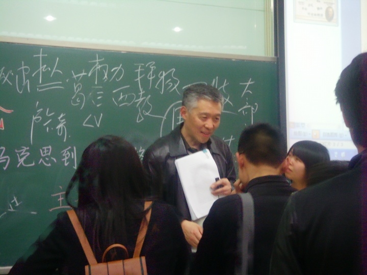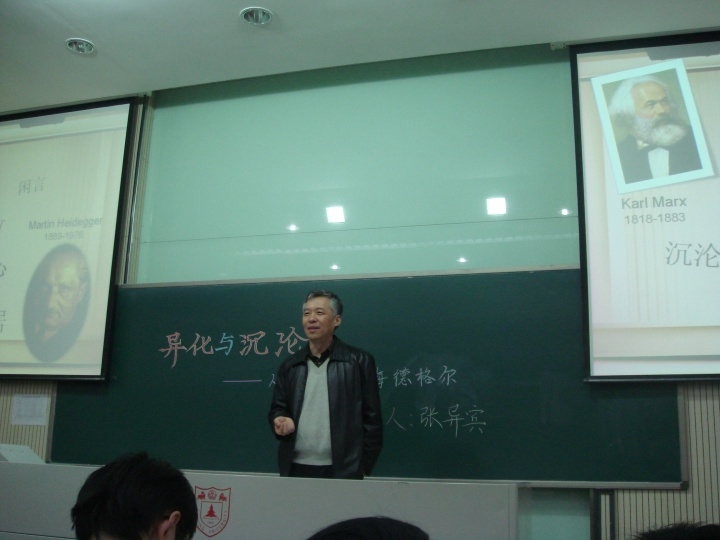 讲座开始前半小时,教室里已座无虚席。晚六点半,讲座正式开始,主持人首先代表哲学系感谢所有听众,并向大家简单地介绍了张老师。接着,在同学们热烈的掌声中,张老师登上了讲坛。他先从青年马克思谈起,通过阐述几个生动有趣的故事和亲身经历,引出了本次讲座的第一个主题——“异化”;接着,老师以独到的文本学方法解读了海德格尔,并综合近年来的研究心得,用好莱坞大片《阿凡达》片段向我们展示了海德格尔对“沉沦”的理解。在整场讲座中,张老师更向大家谈了他自己对于哲学的看法以及学习哲学的重大意义,他认为“哲学不是知识,哲学应该是我们的一种思维方法和生活方式”,并用几个形象的比喻展示了哲学的魅力。