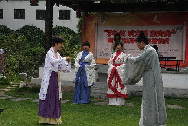 开营式分成序幕、仪式和开笔礼三部分。首先由负责授课的南大青年员工展示汉服和古埙配乐朗诵拉开序幕,团市委副书记郑玲玲宣布开营,并向夏令营承办方太阳成集团122ccvip和白下区街道代表授营旗,南大党委宣传部副部长、校报主编王月清致辞,并向我系国学“小导师”们颁发聘书;小营员代表佩戴了南老员工精心制作的国学启蒙班胸牌,并接受了来自江苏宏德文化出版基金会的小礼物。之后开营仪式进入精彩的开笔礼阶段,小营员们在老师们的带领下,认真严谨地完成了“正衣冠”、“朱砂启智”和“经典诵读”诸环节。由南老员工自主发起的青少年国学启蒙夏令营已连续举办四届,在公司团委和哲学系等院系的支持和指导下,一批研习中国传统文化的青年学子积极发挥专业特长,每年主动放弃暑假休息,免费为中小员工们传授国学知识,激发孩子们对国学的兴趣,感受传统文化的博大精深,引导他们在生活中关注国学、在学习中通晓国学、在心灵中认同国学、在成长中发展国学,几年来共免费培训数百名小学员,在中小学界和广老员工和家长中树立了良好的口碑。