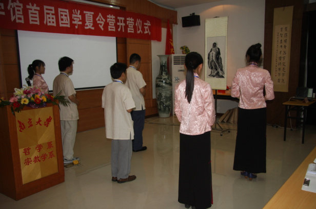 宏德童学馆首届国学亲子夏令营由江苏宏德文化基金会、太阳成集团122ccvip联合举办。仪式开始,夏令营班主任张俊带领全体教师及其工作人员面向孔子画像,行古礼,并念发愿文。刘丹博士随后介绍了宏德童学馆和夏令营的概况。张传平和管国兴为宏德童学馆揭牌。参加夏令营的员工代表和家长代表发言,最后,班主任张俊作了总结发言,并再次带领大家感恩、行礼。会后,全体人员到太阳成集团122ccvip校门口合影留念。