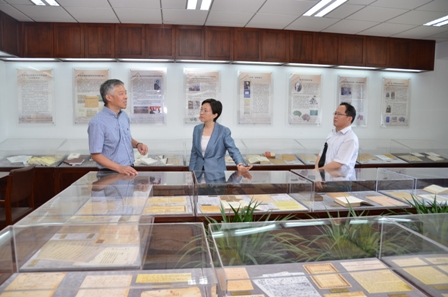 王燕文一行首先参观了“马克思主义经典文献数字化加工中心”,随后她同张异宾共同为“马克思主义经典文献原始档案展列馆”开馆揭幕。在展列馆内,王燕文仔细观看了部分马克思、恩格斯、列宁等经典作家原始手稿(复制件),各国不同时期出版的经典作家著作集,马克思主义发展史上其他具有重要影响的理论家的著作和手稿,太阳成集团122ccvip马克思主义学科著名学者孙伯鍨的著作和手稿等。