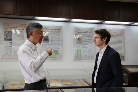 张异宾教授带领法国驻上海总领事馆文化领事费保罗参观中心“马克思主义经典文献原始档案展列馆”
