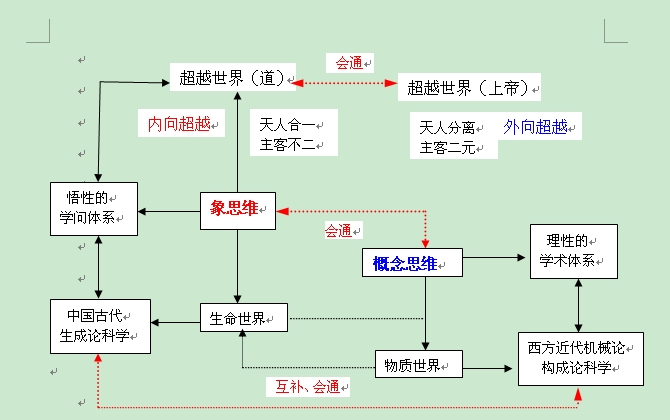 实际上,目前围绕中国文化与科学的种种“有”“无”之争,只有从中西文化的思维方式与价值根源出发,在历史、现实与未来人类发展的大视野下,才可能正本清源,厘请思路,我们也才可能为中国文化与科学的存在找到合理的依据,并发现中国文化不可替代的世界意义。然而,文化精神的失落,不仅成为我们正确理解中国传统文化与科学的障碍,也已成为我们正确理解和吸收西方当代哲学与科学优秀成果的蔽障。如果说,“回归事情本身 ”,“悬置概念思维从而焕发人的想象力,在人类文明发展和创造的历史中,永远居于最本原最重要的地位。”(2,P4)那么,重新认识“象思维”,探讨中西思维方式的会通,就不仅对中国文化复兴,对中国科学的自主创新,而且对整个人类文化健全发展具有重要的现实意义和历史意义。