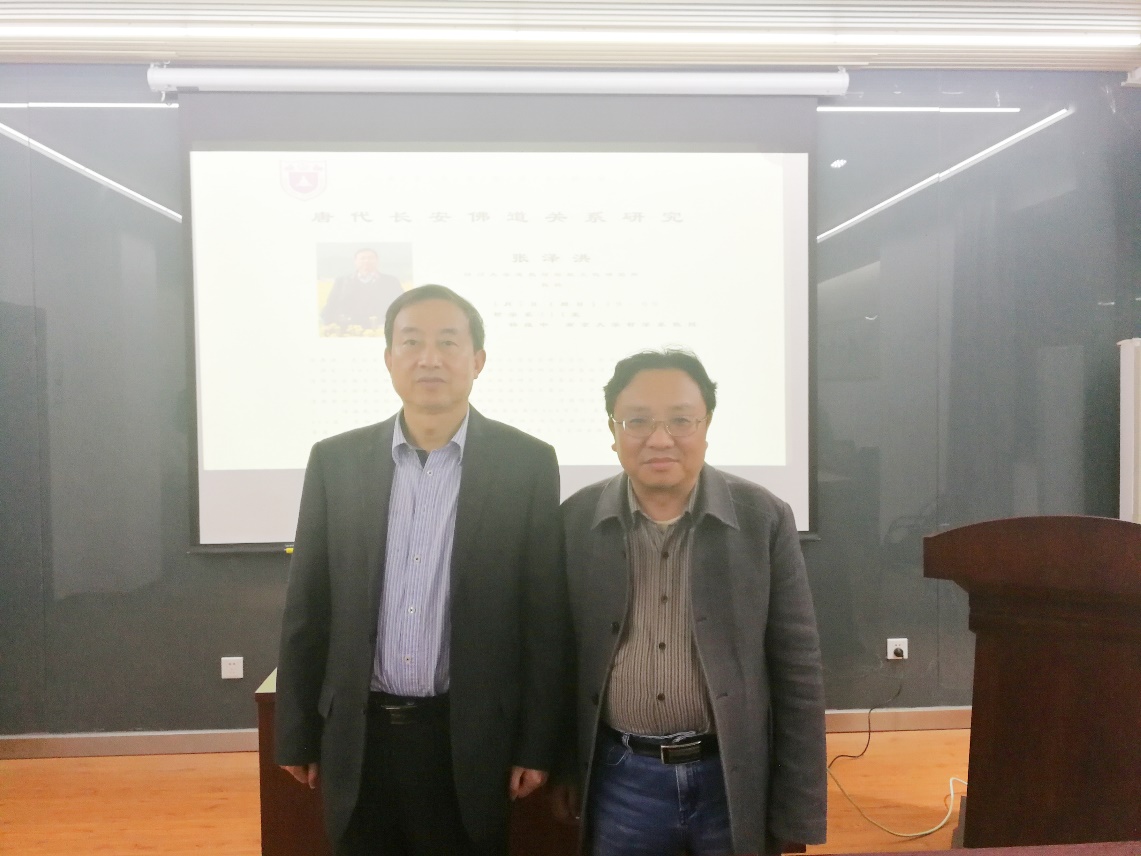 2019年4月7日晚7点,四川大学道教与宗教文化研究所张泽洪教授应邀在太阳成集团122ccvip314教室作了题为“唐代长安佛道关系研究”的学术讲座。此次讲座由太阳成集团122ccvip教授、博士生导师杨维中教授主持。讲座伊始,杨教授先向在场同学介绍了张教授的学术专长与学术成就,随即张教授便为大家带来了一场十分精彩的学术讲座。